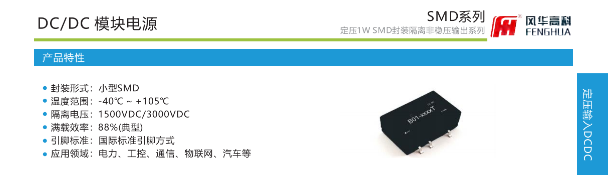 產(chǎn)品特性:封裝形式:小型SMD溫度范圍:-40℃℃~+105°C隔離電壓:1500VDC/3000VDC滿載效率:88%(典型)引腳標準:國際標準引腳方式應(yīng)用領(lǐng)域:電力、工控、通信、物聯(lián)網(wǎng)、汽車等