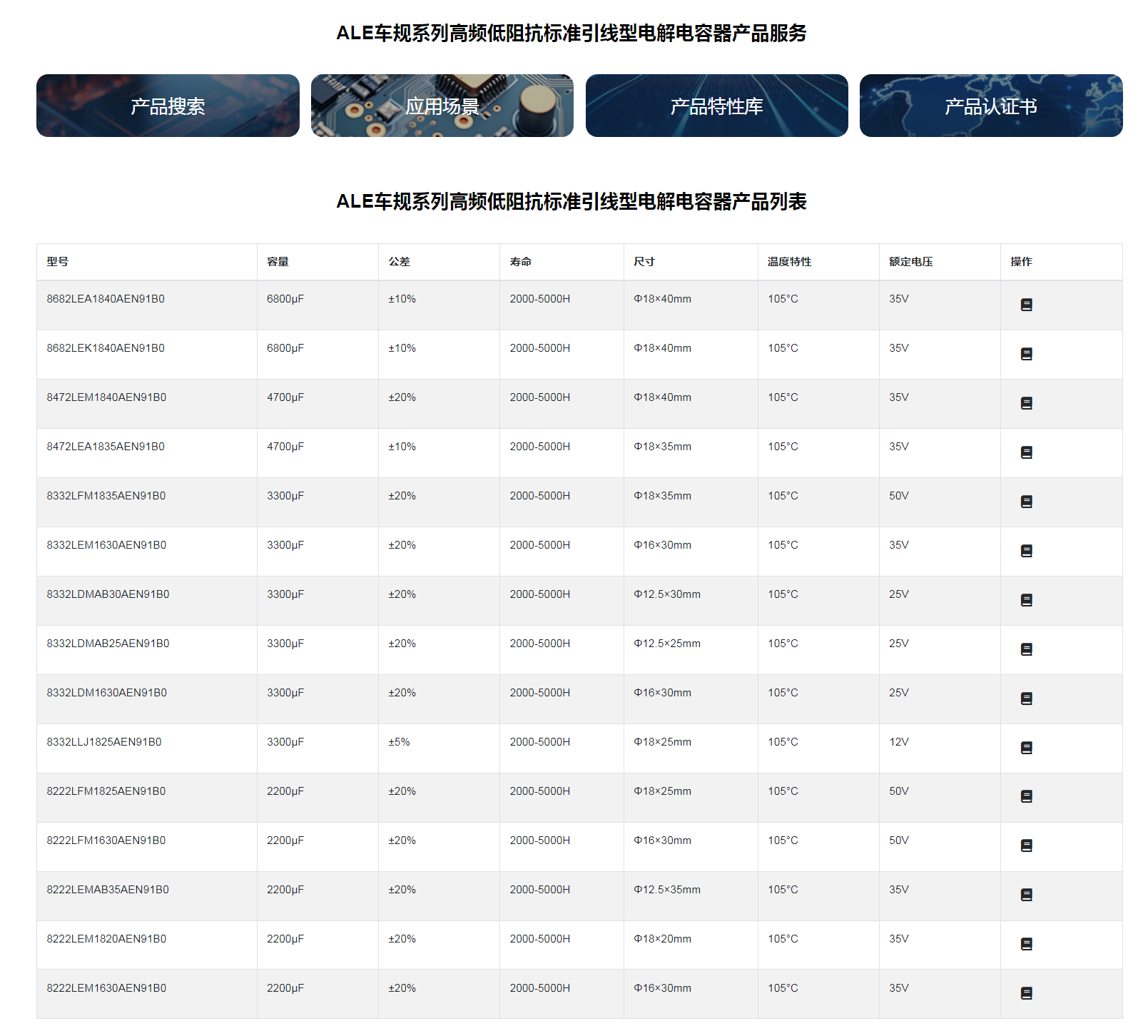■ALE車規(guī)系列高頻低阻抗標(biāo)準(zhǔn)引線型電解電容器◆特征* 壽命: 105℃ 2000~5000 小時(shí)* 低阻抗特性* 符合 AEC-Q200* 符合 RoHS◆應(yīng)用:* 適用于汽車模塊電子產(chǎn)品