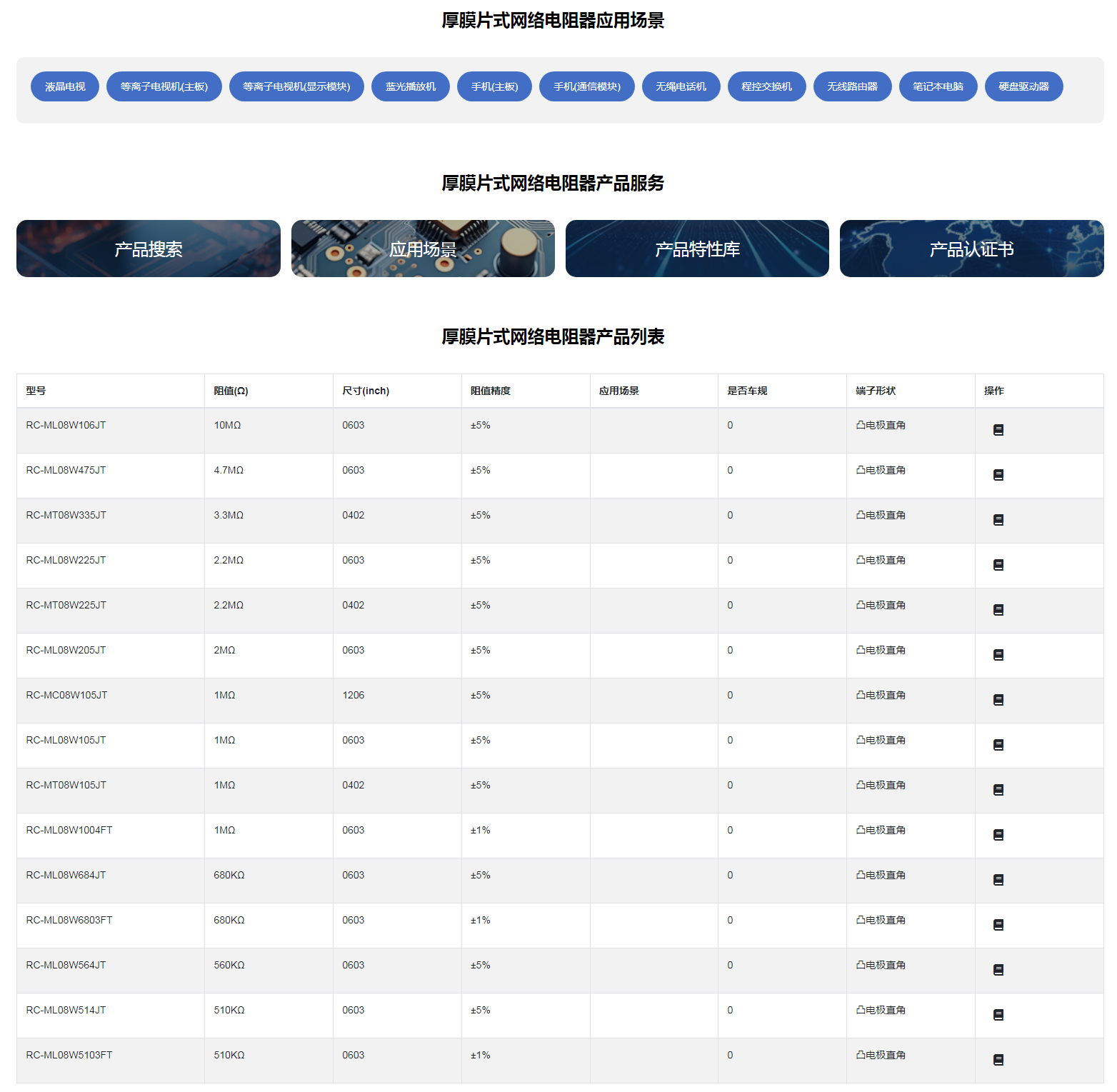 厚膜片式網(wǎng)絡(luò)電阻器體積小、重量輕適應(yīng)再流焊電性能穩(wěn)定,可靠性高裝配成本低,并與自動貼裝設(shè)備匹配機(jī)械強(qiáng)度高、高頻特性優(yōu)越符合RoHS指令要求符合無鹵素要求應(yīng)用領(lǐng)域:廣泛應(yīng)用于家電、計算機(jī)、通訊、工業(yè)自動化及消費(fèi)類電子產(chǎn)品等領(lǐng)域。
